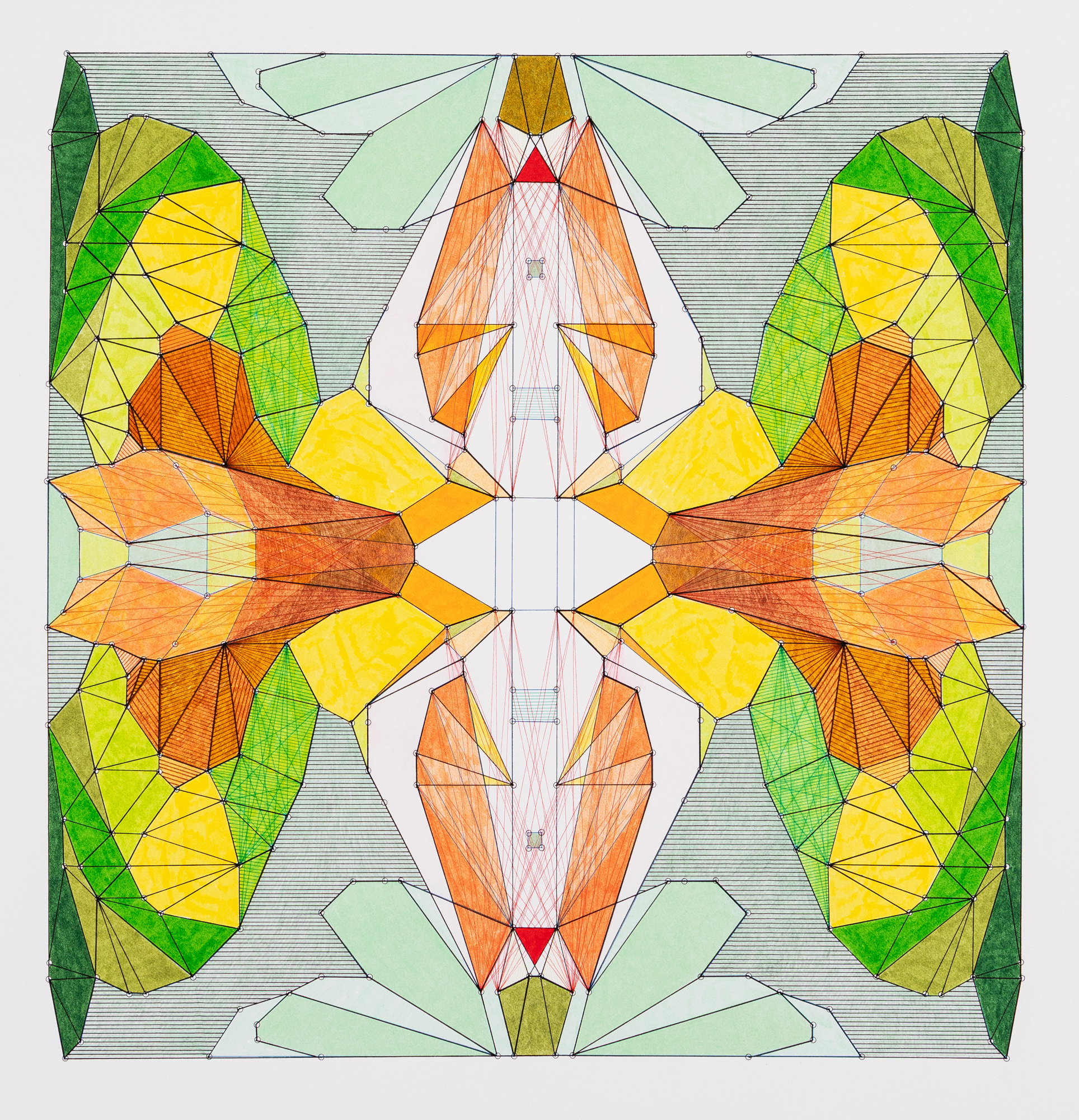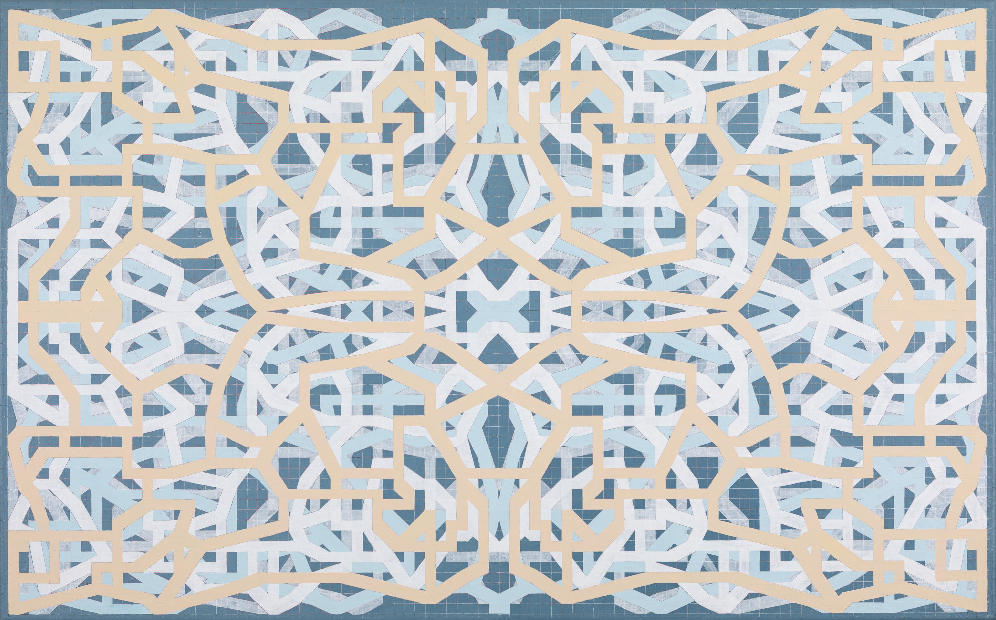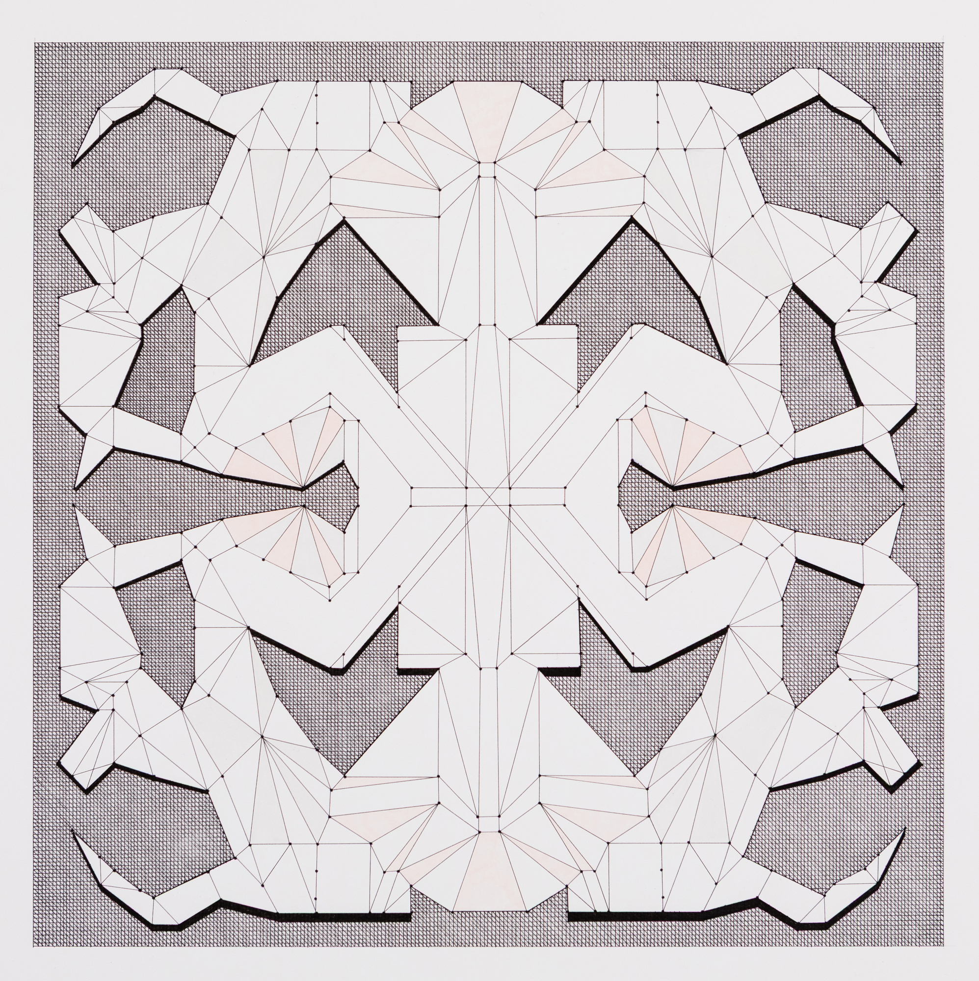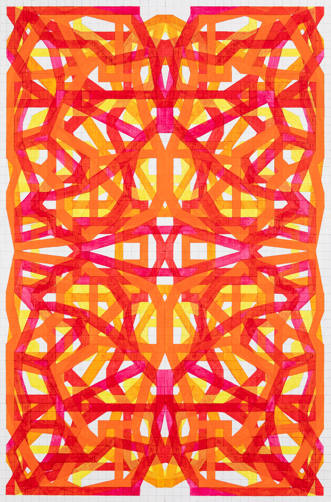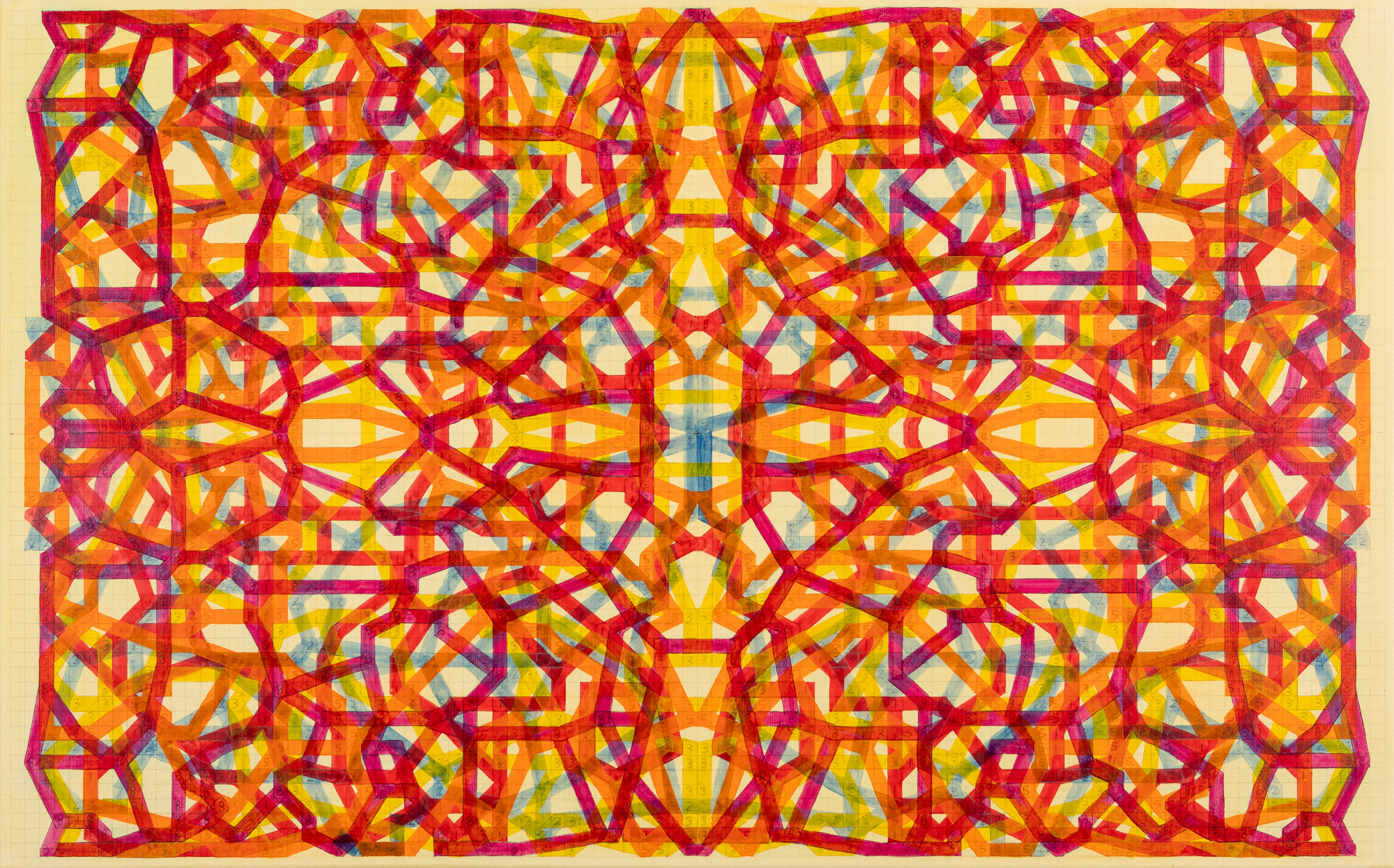 What began as an inquiry into symmetry gradually shifted toward a broader interest in emergence itself: how structure can function as an environment in which experience unfolds, rather than as an image to be controlled. Over time, palindromes and chiral forms gave way to larger fields built from mathematical relationships, mirrored quadrants, and frameworks that permit randomness to operate within strict limits. The solution is embedded in the system, and the act of painting becomes a process of revelation, watching coherence appear through rhythm, repetition, and chance.